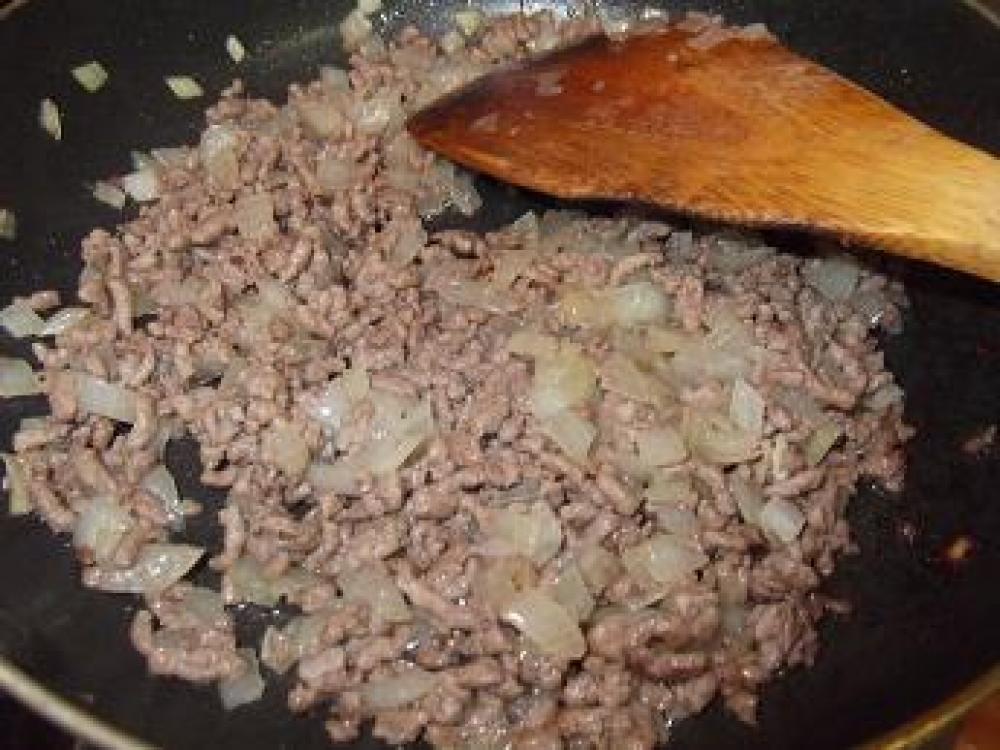 ![]() フライパンにバターを入れ弱火で玉ねぎを炒めます。透きとおってきたら挽肉・塩コショウ・ナツメグを入れて強火で炒めます。