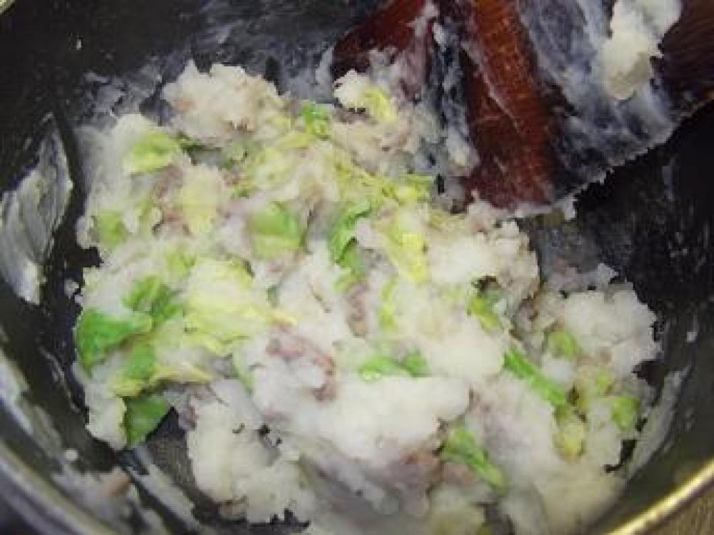 ![]() じゃがいもを切り塩コショウを入れて茹でます。汁を捨て牛乳を入れて弱火で混ぜます。