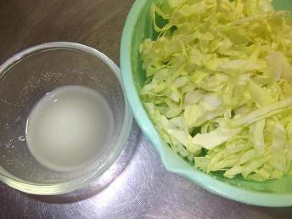 ![]() キャベツを太目の千切りにします。芯の部分はスライスしてから粗みじん切りにします。