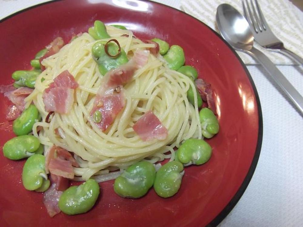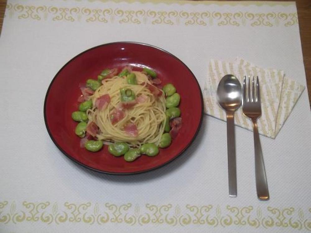 ![]() パスタ&茹でたそら豆を入れて3~4回ユサユサしたらBを入れて味をととのえます。