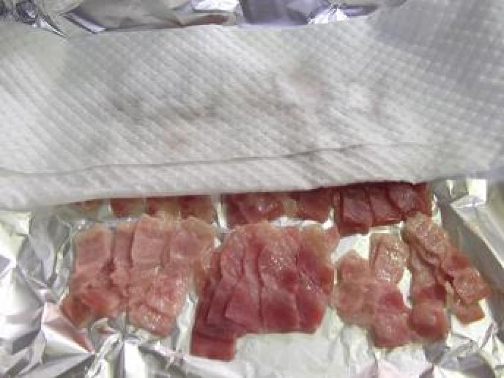 ![]() 出た余分な脂をキッチンペーパーで押さえます。