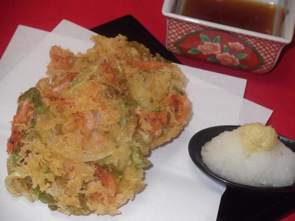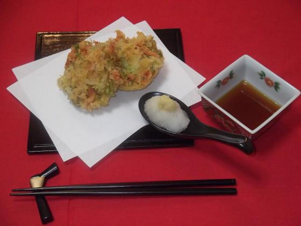 ごま油とサラダ油を半々入れて熱し、衣を1滴入れてパーっと散ったらおたまに具材をのせて静かに入れて揚げます。