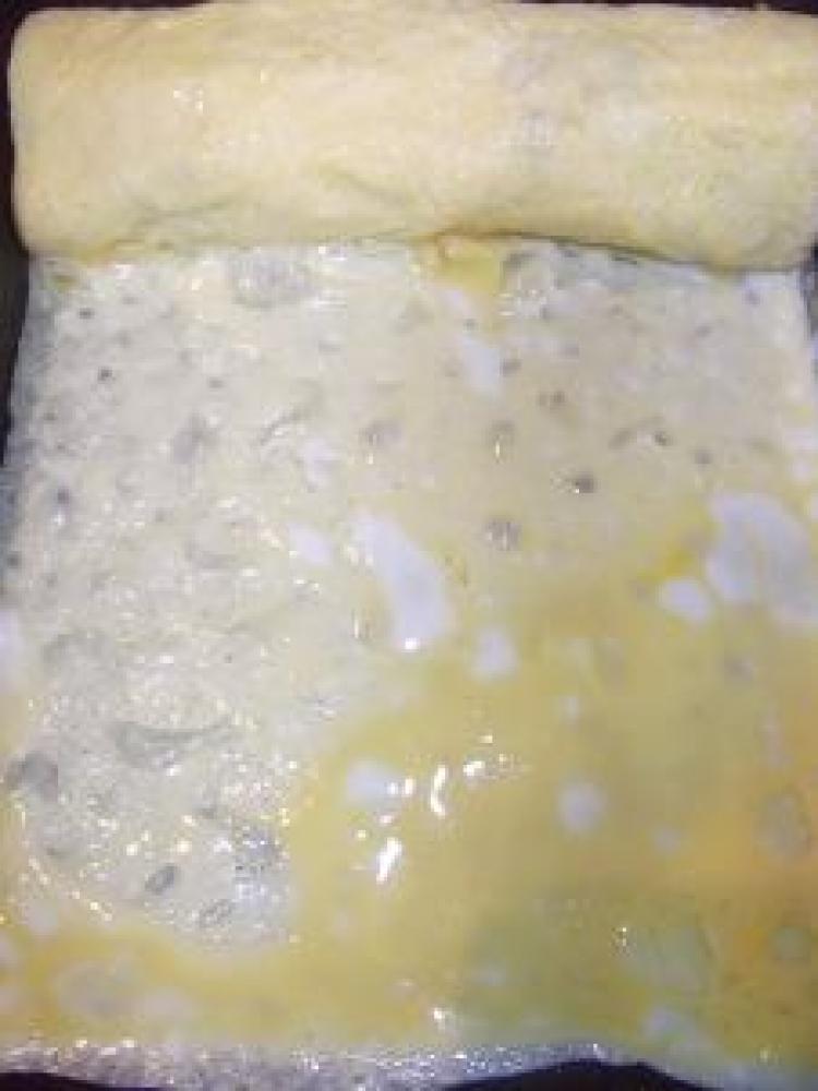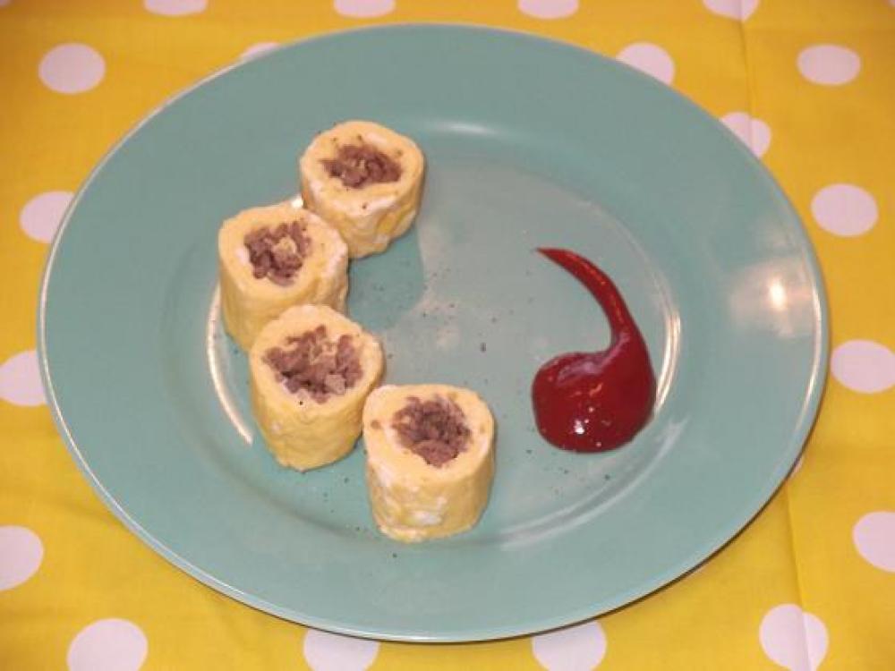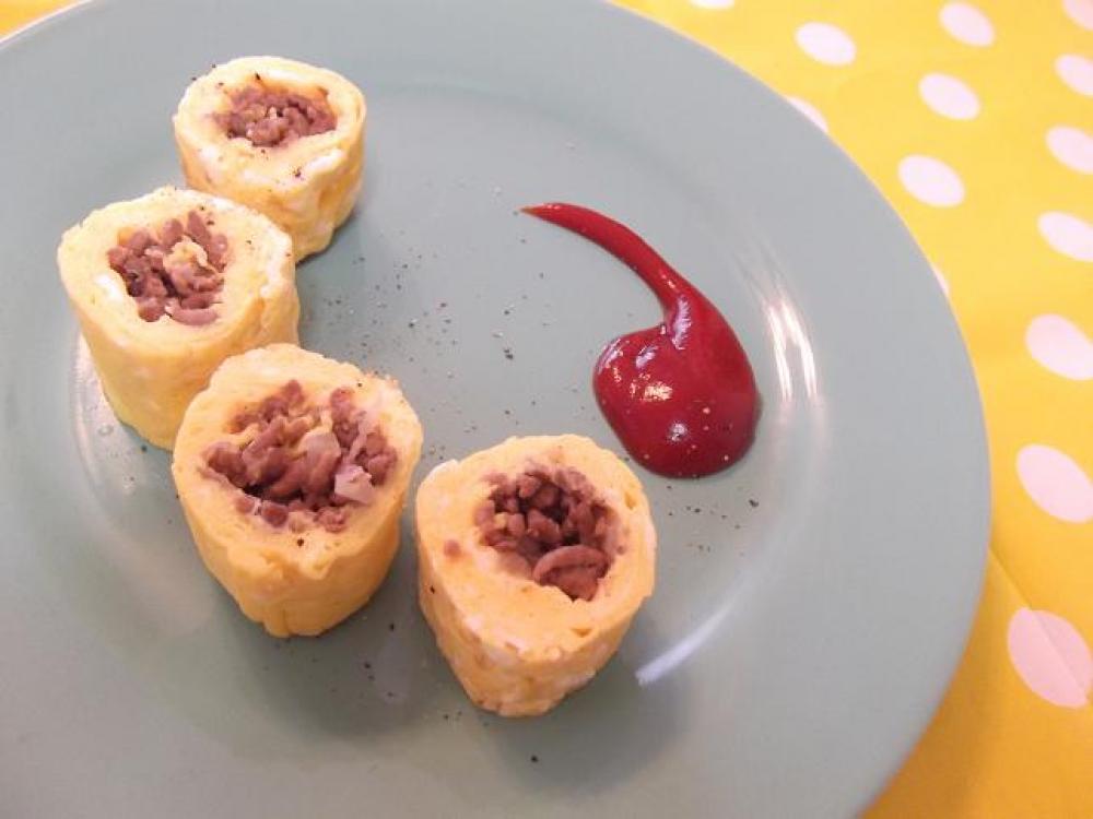 ![]() 卵焼きパンにバターを入れて混ぜておいたAを少し入れ、半分固まったら1をのせて・・・