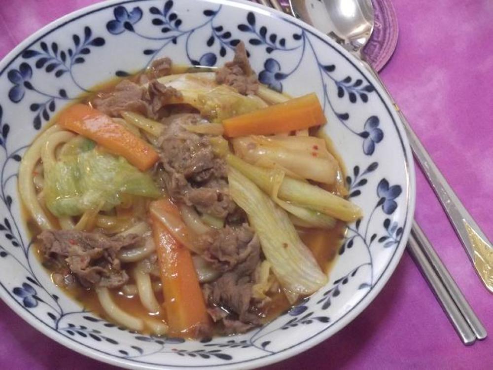 2の鍋をサッと拭いてAを入れてブツブツいってきたら野菜(レタス以外)&牛肉&うどんを入れて煮込みます。