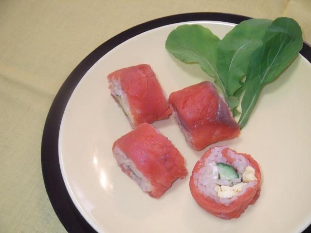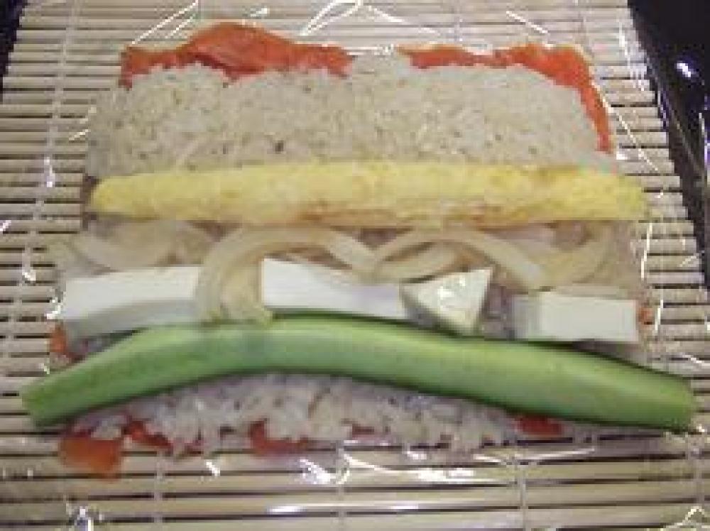 ![]() ご飯の上のラップを取り、具材を並べて巻き、ラップごと切ります。