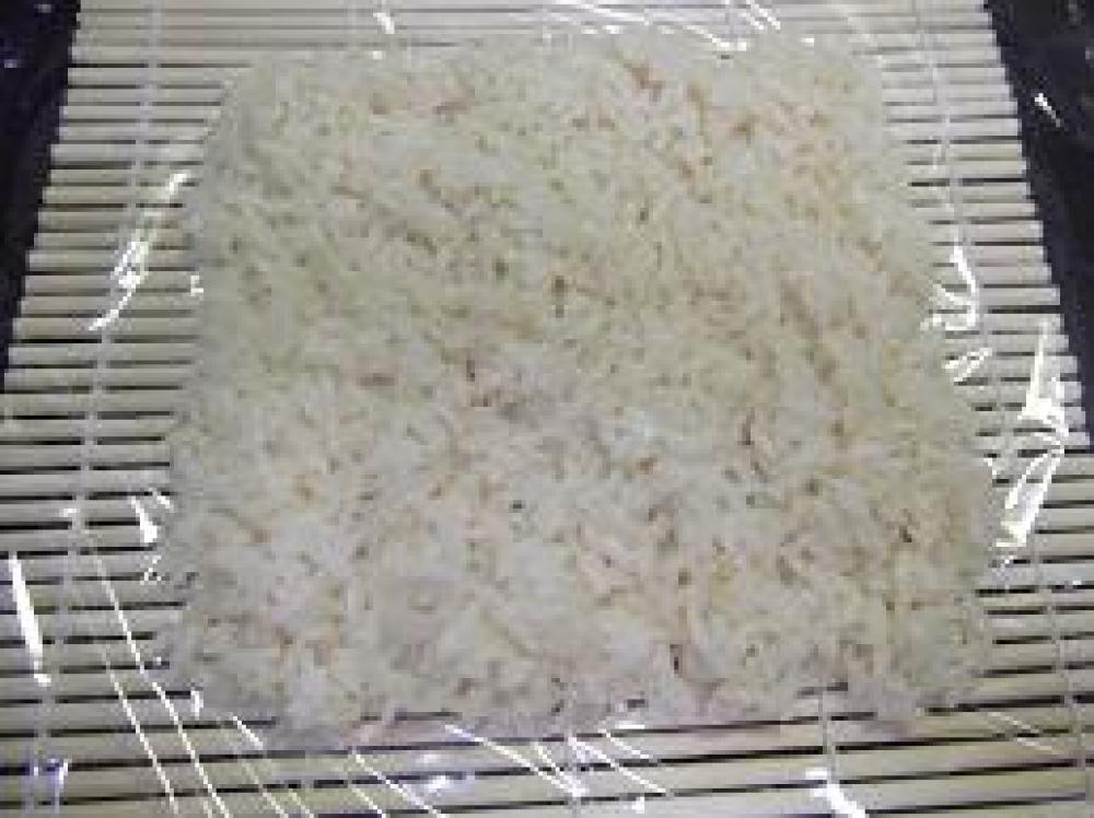 ![]() まきすの上にラップを置き、ご飯をのせます。