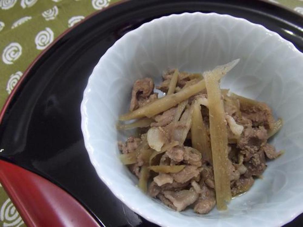 B&ごぼう&しょうがを鍋に入れて強火にかけ、沸騰したら中火にして水分が半分以下になるまで煮ます。