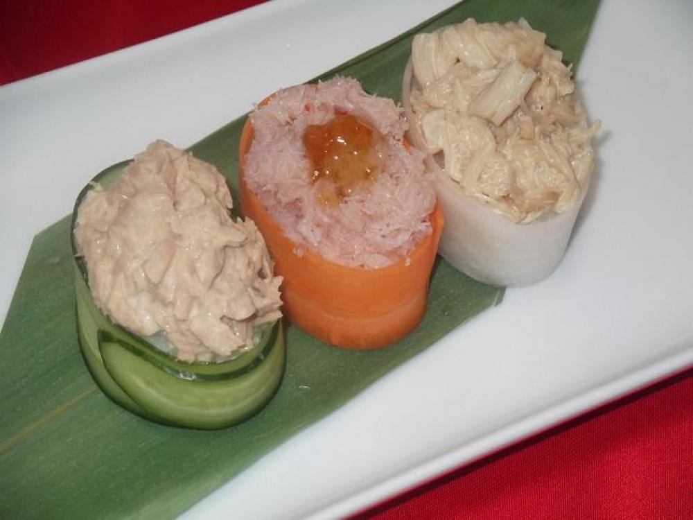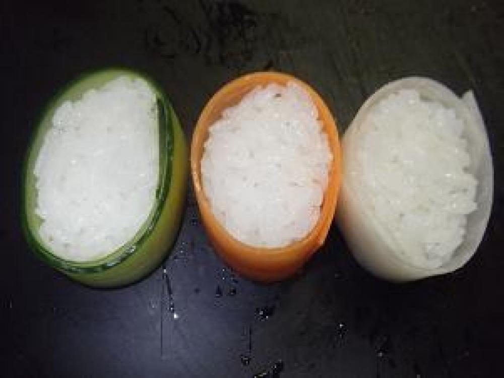 ![]() 一口大に寿司飯を握り、周りにピーラーで薄切りにした野菜を巻いて、ネタをのせたら出来上がり!