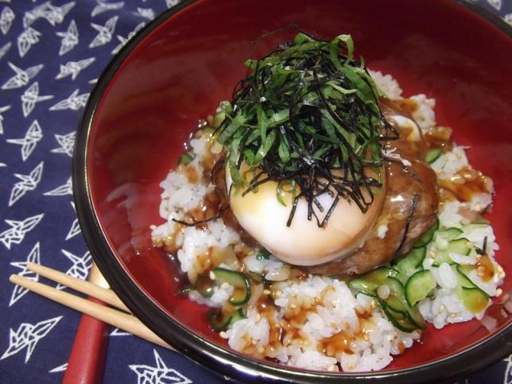 ![]() 6にハンバーグ・温泉卵とのせて、Cのあんをかけて、Dをのせたら完成です