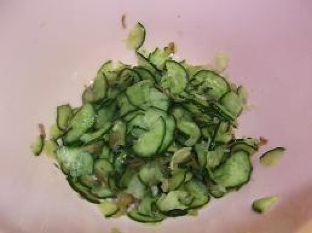 ![]() きゅうりは縦半分に切ってから薄切りにし、みょうがは小口切りにし、Bと混ぜてギューギューもんで水けを絞っておきます。