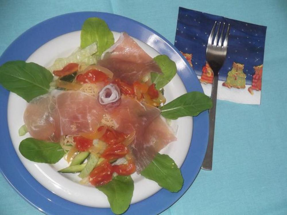 器にルッコラを置き、パスタを盛りつけ上に生ハムをのせたら出来上がり!