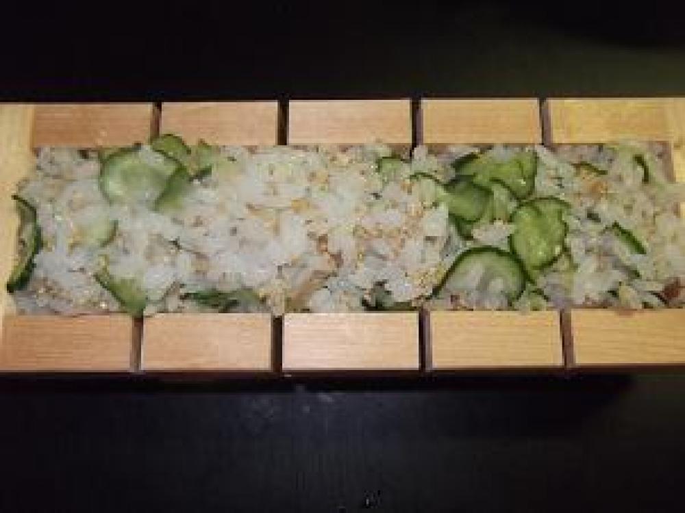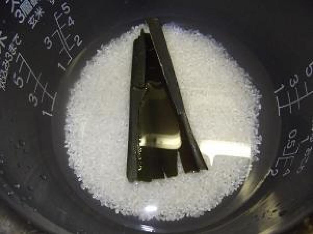 ![]() 炊飯器に出汁昆布を1枚のせて、寿司飯用に水加減してご飯を炊きます。