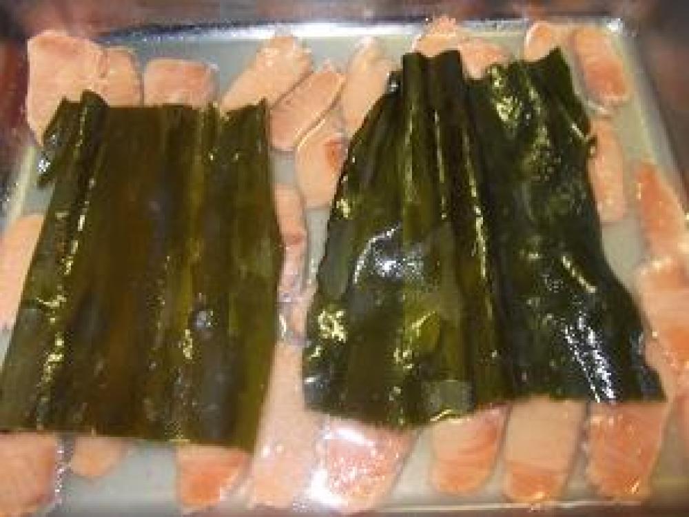 ![]() 刺身用のマスをスライスしバットなどに並べ、かぶるくらいの酢を入れて上に出汁昆布をのせて、10分位おきます。