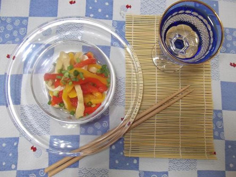 ![]() 焦げたパプリカを氷水に取り、皮を剥き細切りにします。