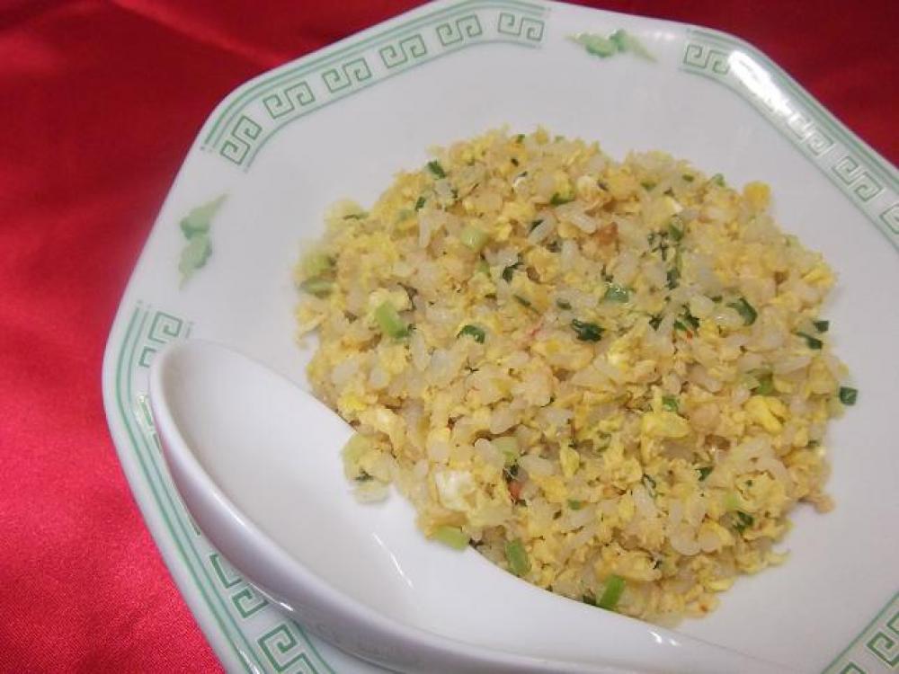 温かいご飯に、卵とカニ缶を混ぜて、ご飯粒をバラバラにしておきます。