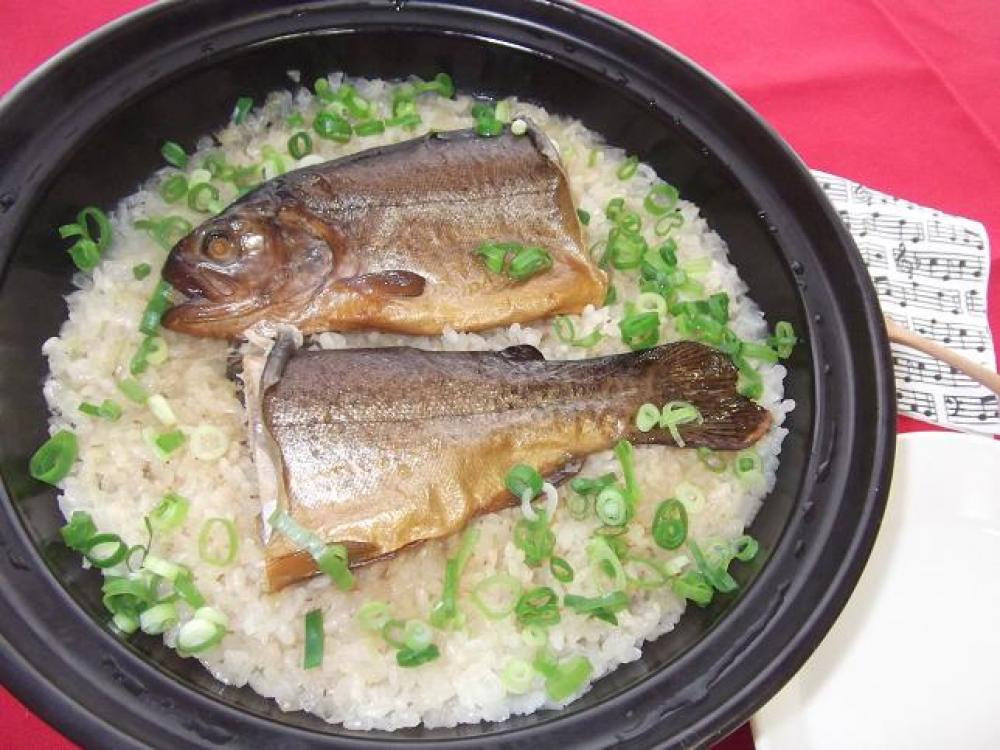 お米も透き通ってきたらAを入れて上に鱒をのせます。