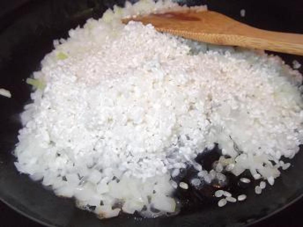 ![]() 玉ねぎが透明になったらお米も入れて炒めます。