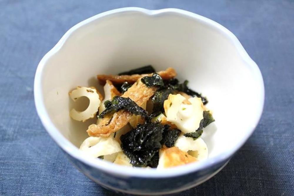 ちくわ・味付けいなり・千切った韓国海苔を、全体が馴染むように和えたら出来上がり。
