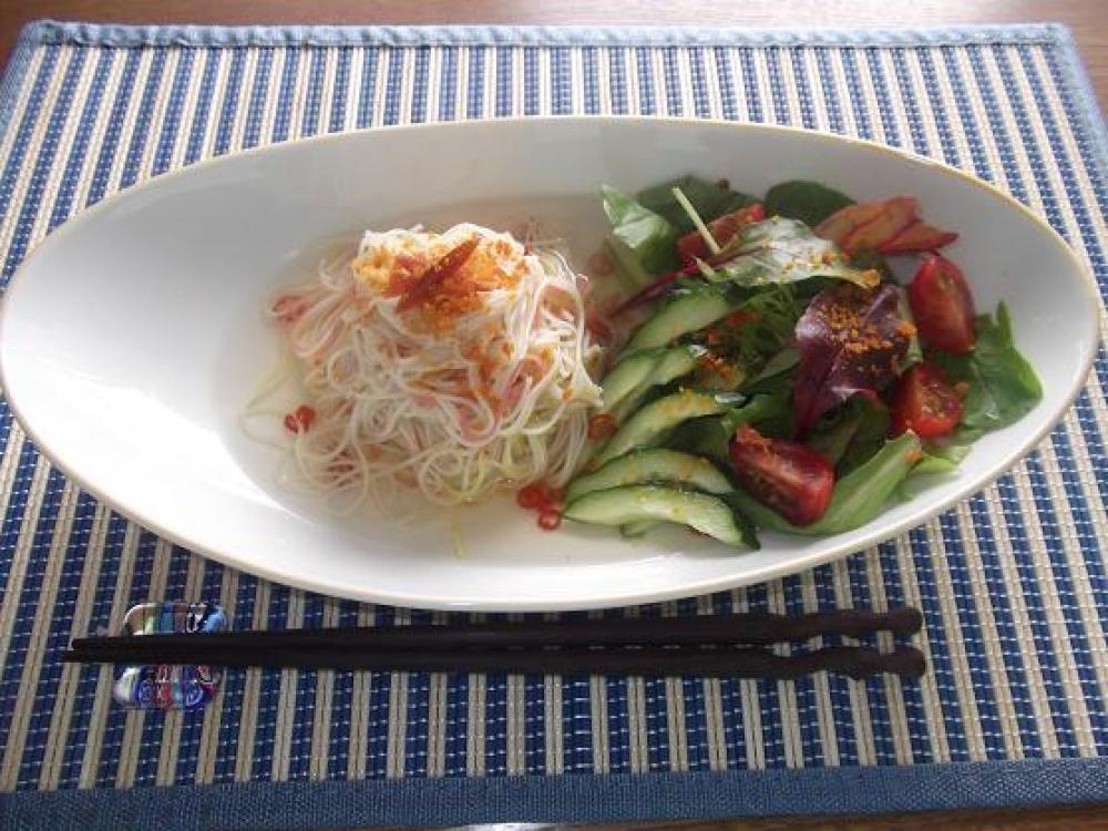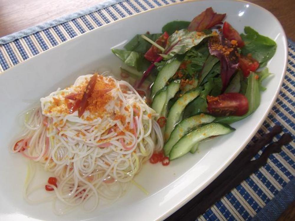 ![]() サラダの具材も盛り付け、全体に「からすみ」の残りを振りかけ、素麺にものせて、横から2を注ぎ入れます。