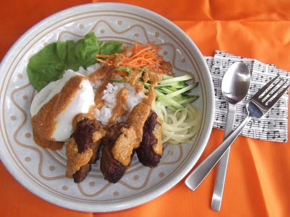 ![]() 器にサラダ菜などを敷き、ご飯・千切りきゅうり&人参・アチャール・コフタ・目玉焼きとのせ、上から4のソースをかけたら出来上
