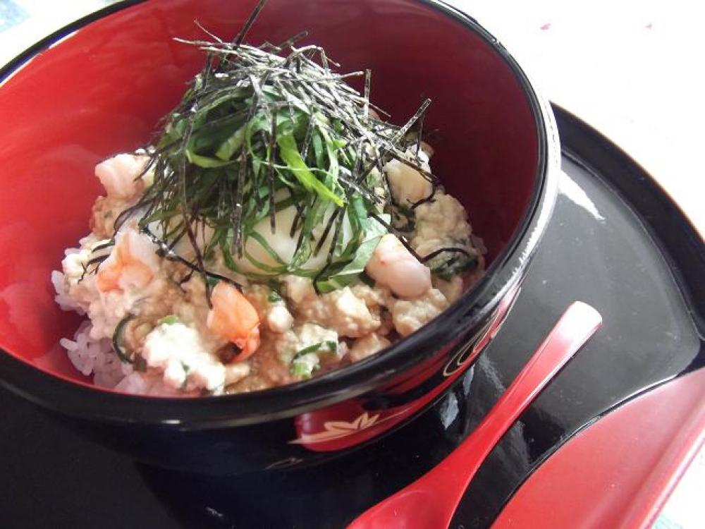 A&水けを絞ったB&ネギ&エビを混ぜ5の上にかけ、温泉卵をのせめんつゆをかけ、大葉と海苔をのせたら出来上がり