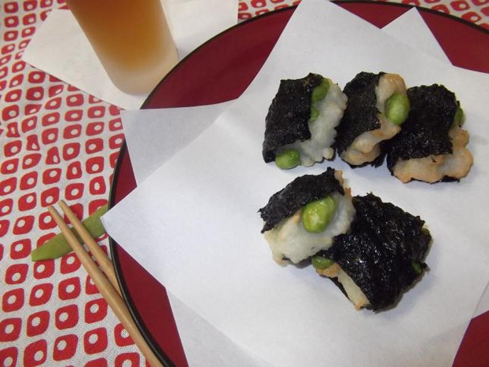 ![]() 海苔に挟むようにして包み、菜箸を入れて小さい泡が出る位の温度で1分くらい揚げたらOKです。