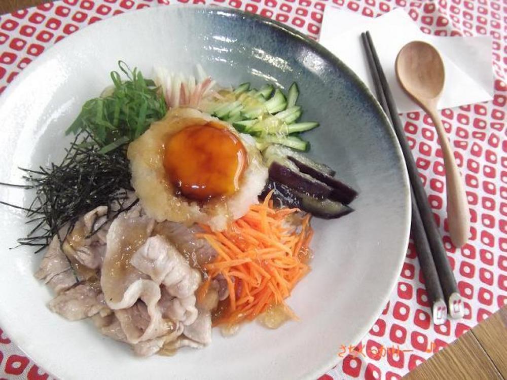 器にご飯を盛り、具材を順番に並べ、中央に大根おろしを置き、漬け卵をのせます。