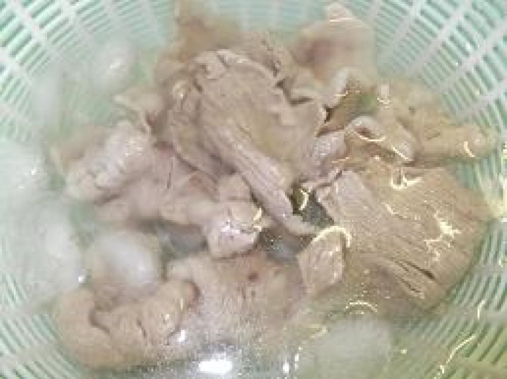 ![]() ただの氷水にとります。(熱い豚肉を入れるので氷はすぐに溶けてぬるま湯になりますがそれでOKです)