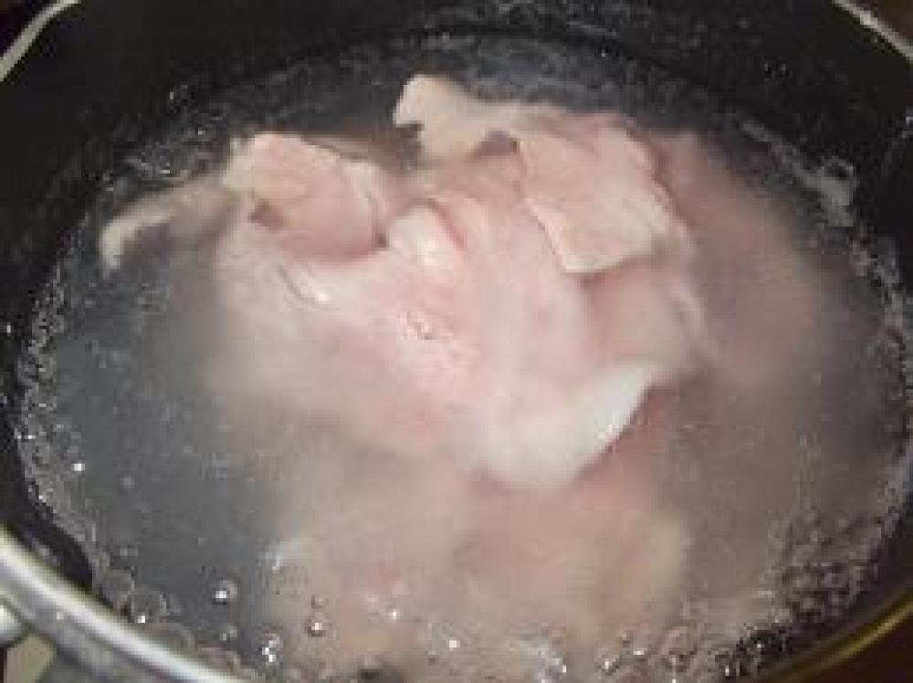 ![]() 豚肉に片栗粉をつけて沸騰した湯に入れて茹でます。