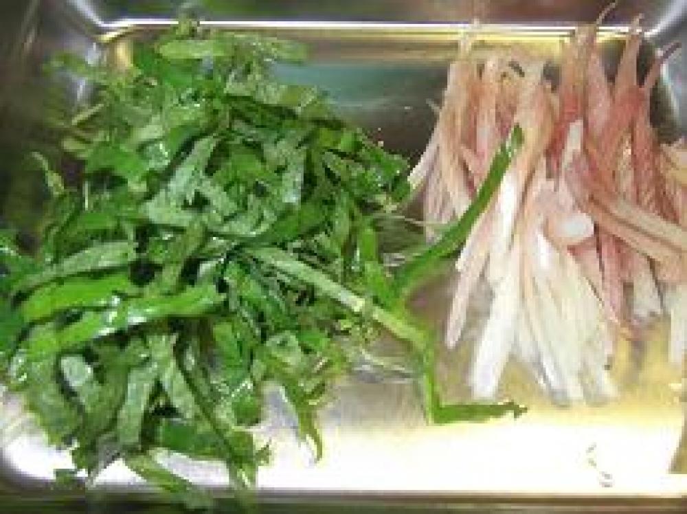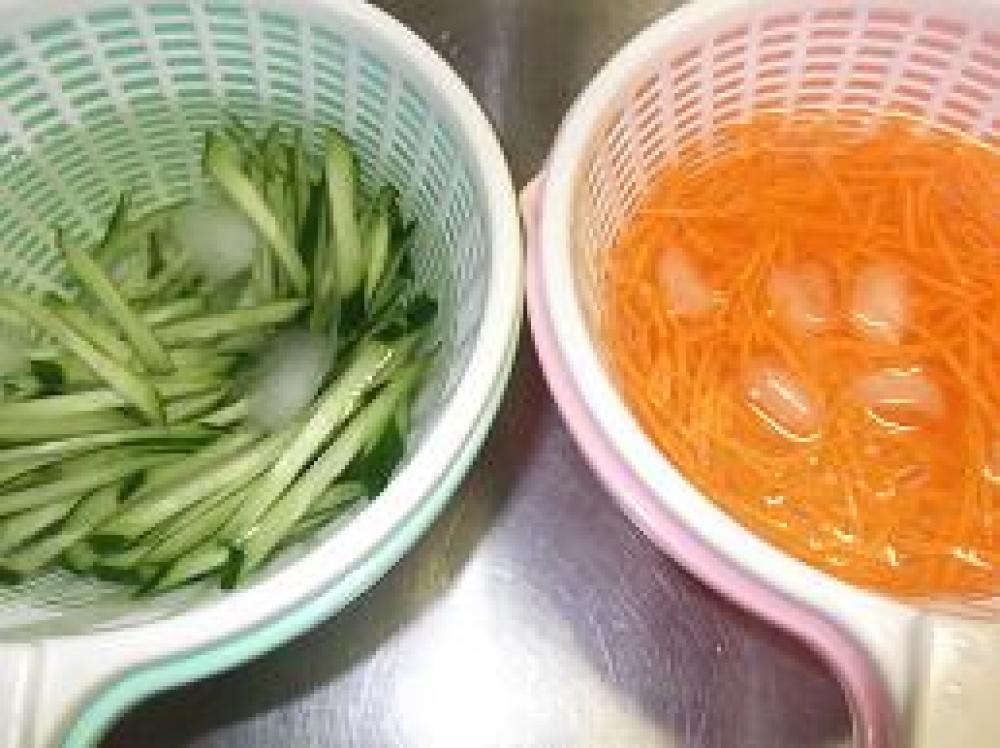 ![]() きゅうりを千切りにして、氷水に塩を少々入れたところに漬けておきます。人参も同様に千切りにしてけておきます。