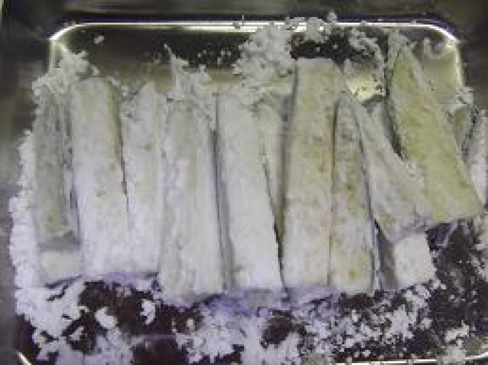 ![]() なすを短冊切りにして、片栗粉を付けて沸騰したお湯に入れて3分茹でます。