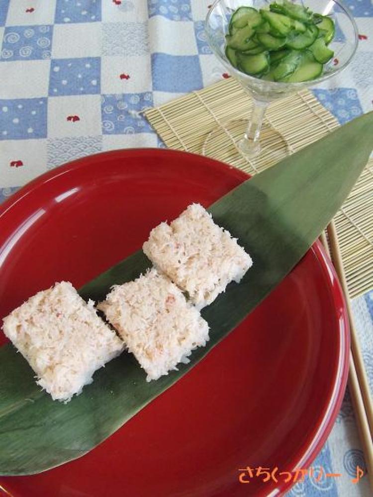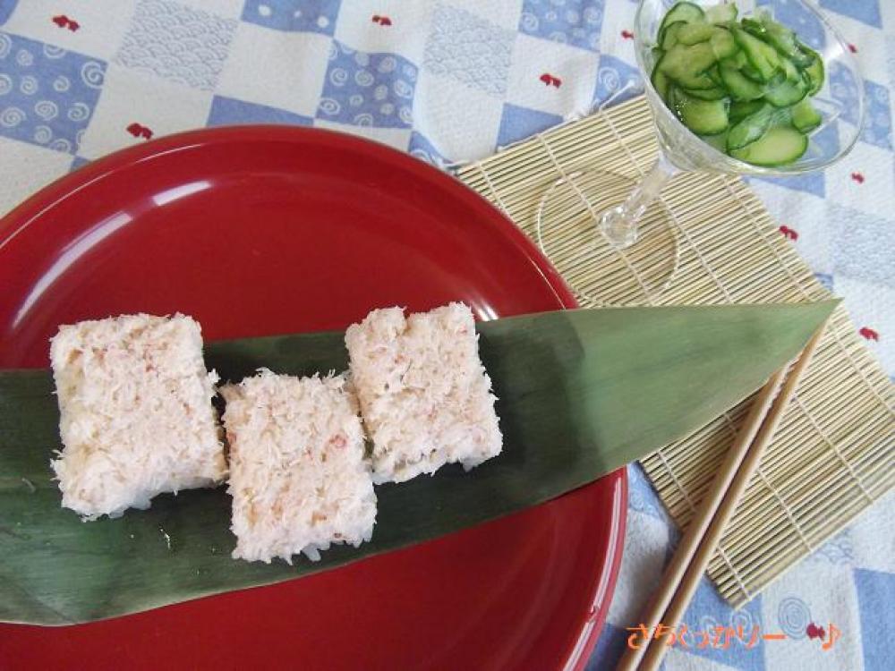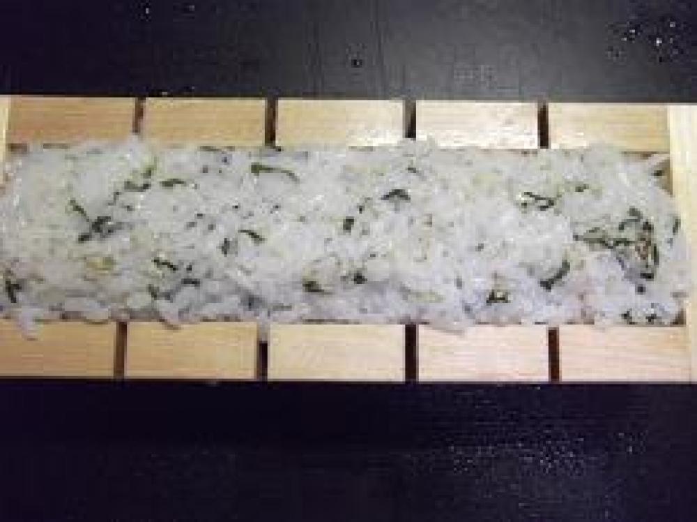 ![]() 炊きあがった1に混ぜておいたBを合わせて寿司飯を作り、刻んだ大葉&白ゴマも合わせ3の上に入れます。