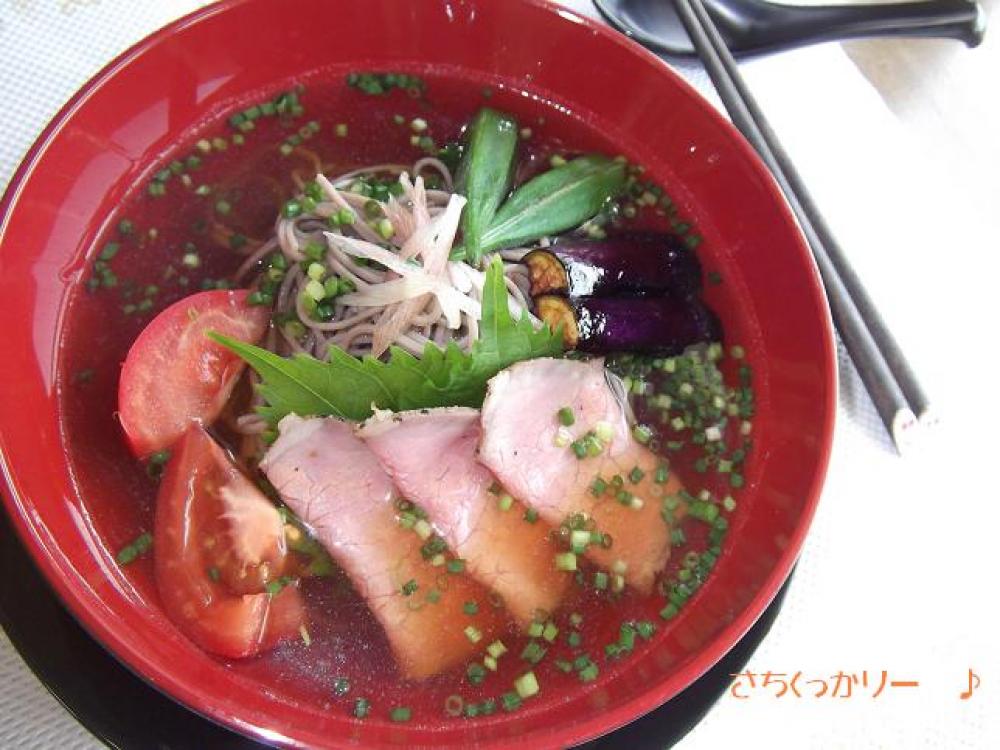 ローストビーフをスライスして、茄子は切って素揚げにして、オクラは塩少々で板ずりして洗い、1分チンします。