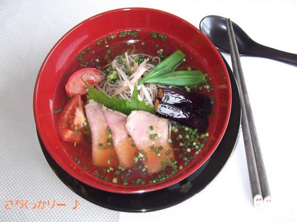 ![]() 器に蕎麦と具材を盛りつけ、横からスープを濾しながら入れ、最後に万能ねぎを散らします。