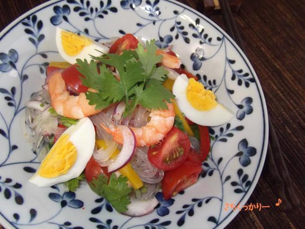 ~お料理~鍋に湯を沸かし、塩少々を入れて春雨&エビを一緒に茹でます。1分になったらパプリカも茹でて全部ザルに上げます。