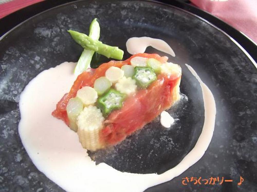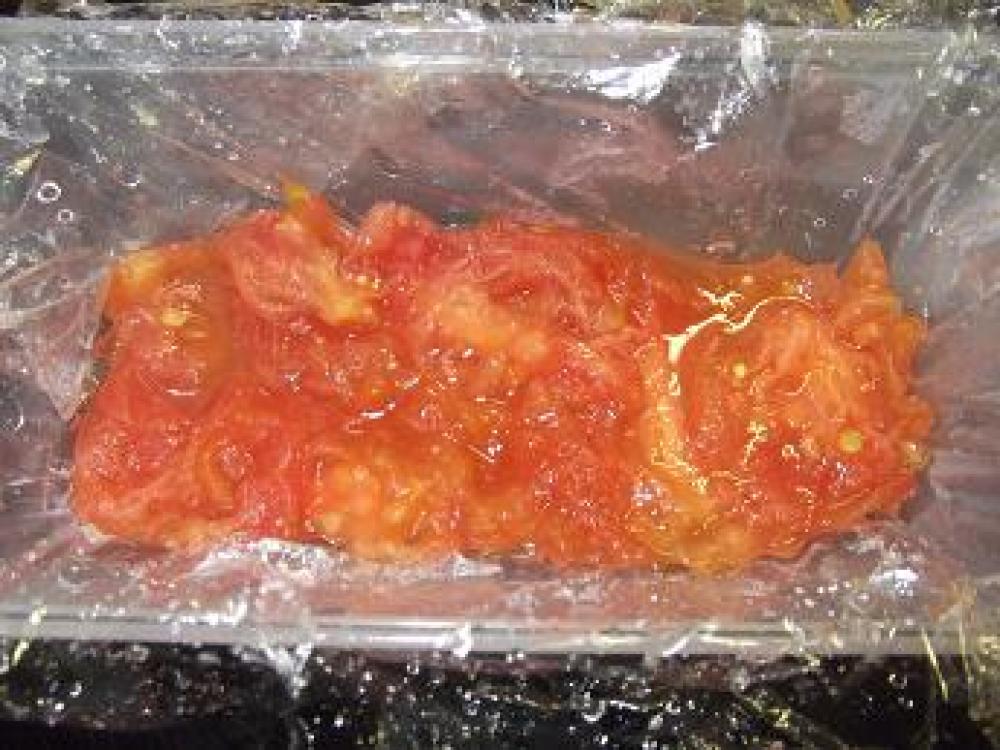 ![]() 型に水に濡らして絞ったラップを敷きトマトを並べます。