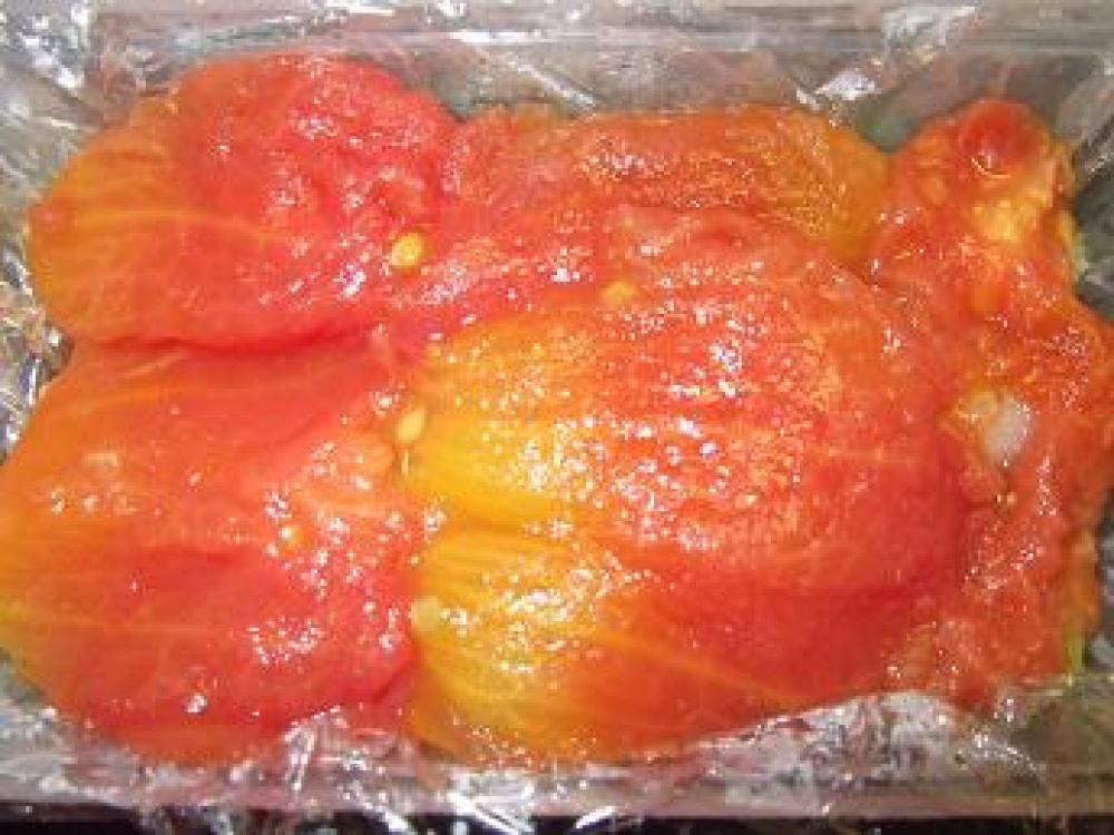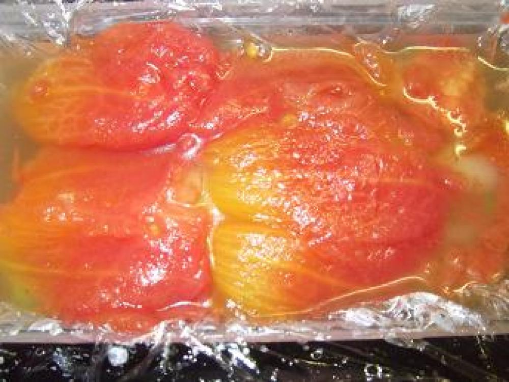 トマトは湯むきする時に、いつもより1分長く熱湯に漬け皮を剥きタネを少し取って、軽く塩しておきます。