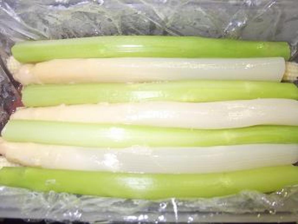 下ごしらえ:グリーンアスパラガスは、根に近い固い部分をピーラーで剥き先を3cm分切って軽く塩して50秒~1分チンします。