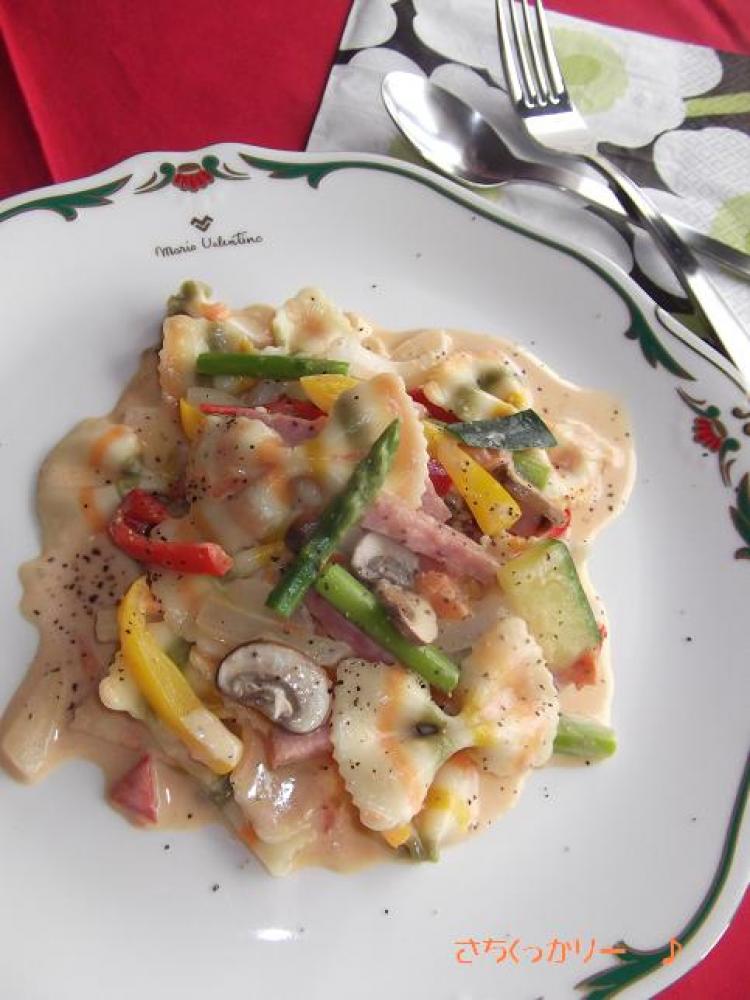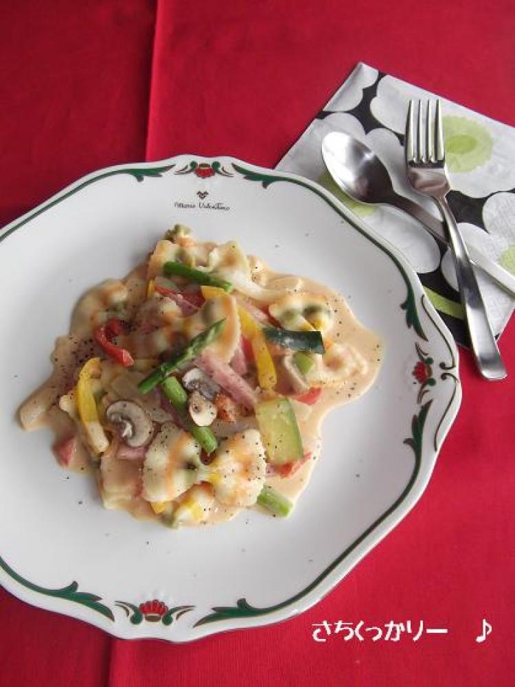 茹で上がり1分前にハム・トマト以外の具材も一緒に入れて引き上げます。