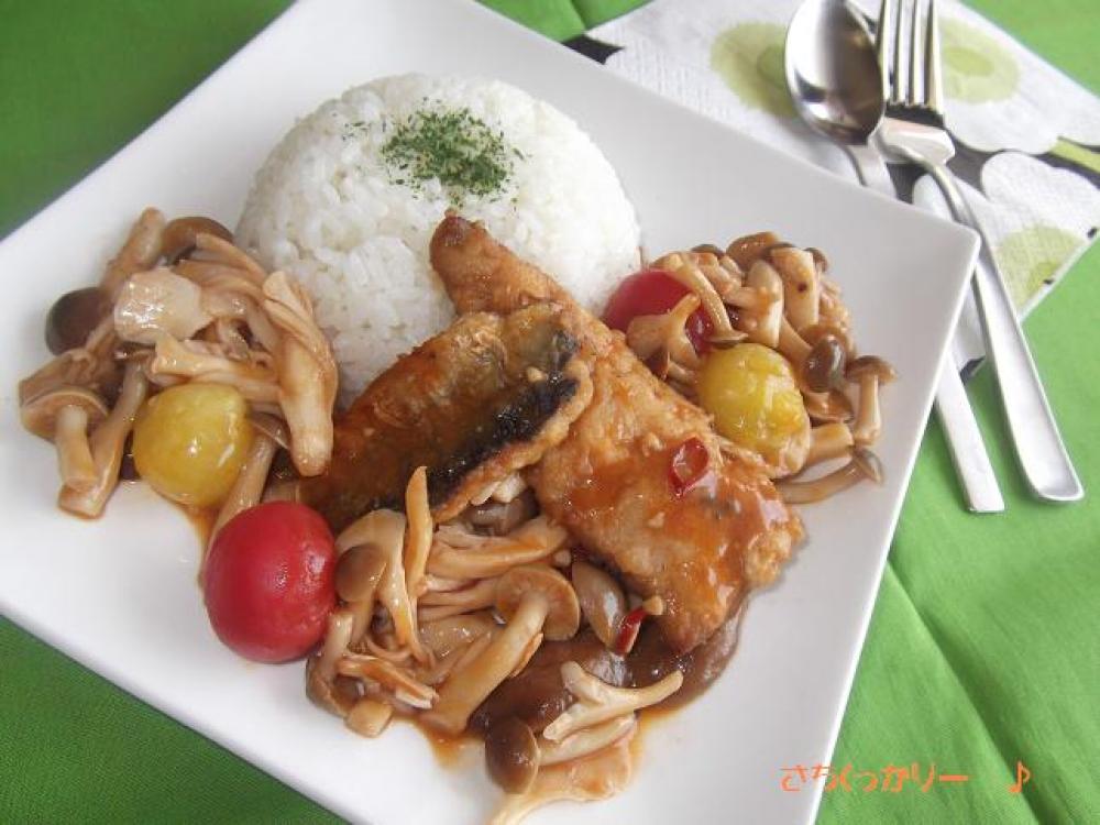 器にご飯を盛りパセリを振り、秋刀魚&きのこを添えて頂きます。