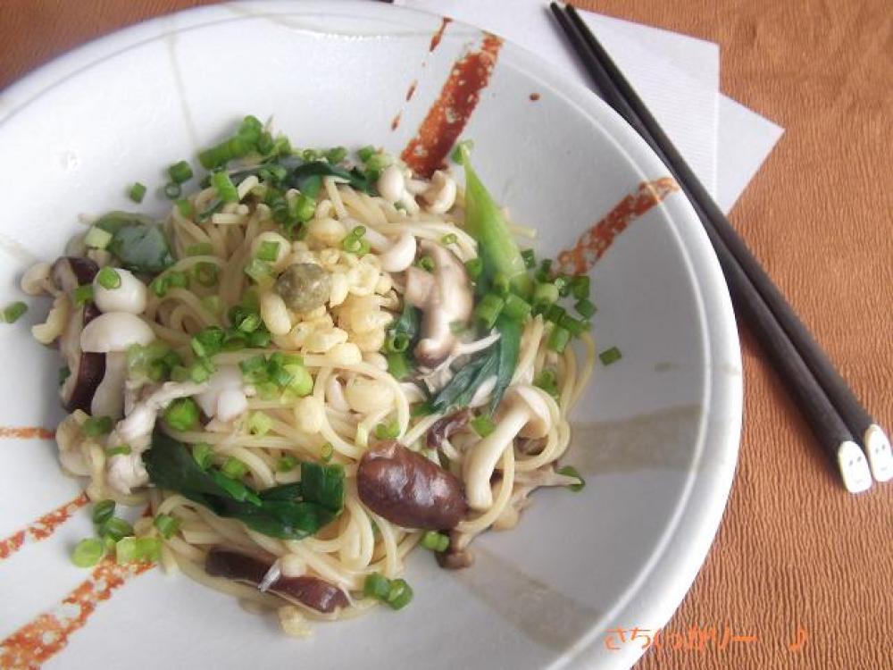 ![]() 火を止めて、天かす大さじ2を入れてユサユサして、器に盛り、Bをトッピングしたら出来上がり