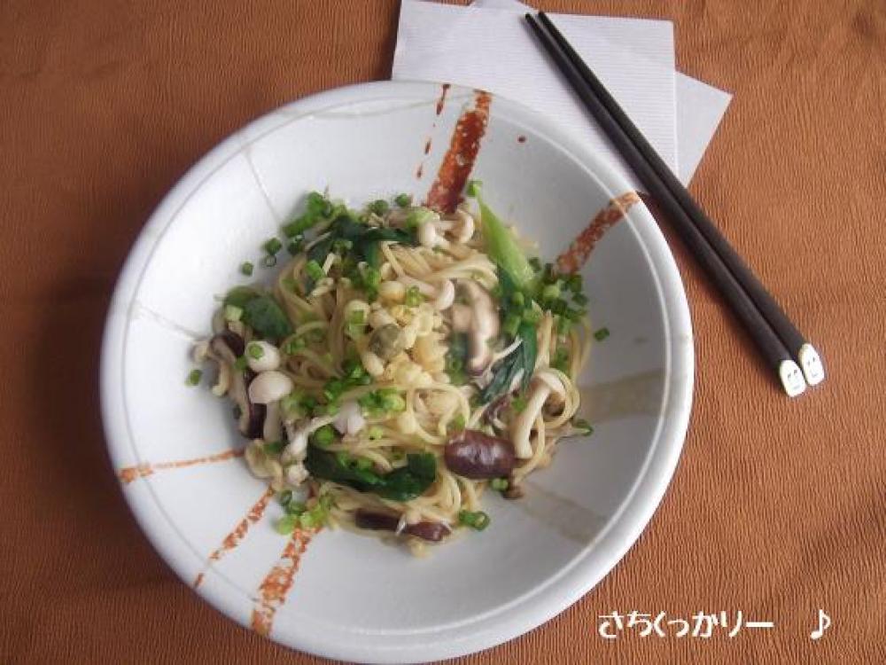 きのこ類がしんなりしたら4に茹であがったパスタを入れ、Aも入れて絡めます。