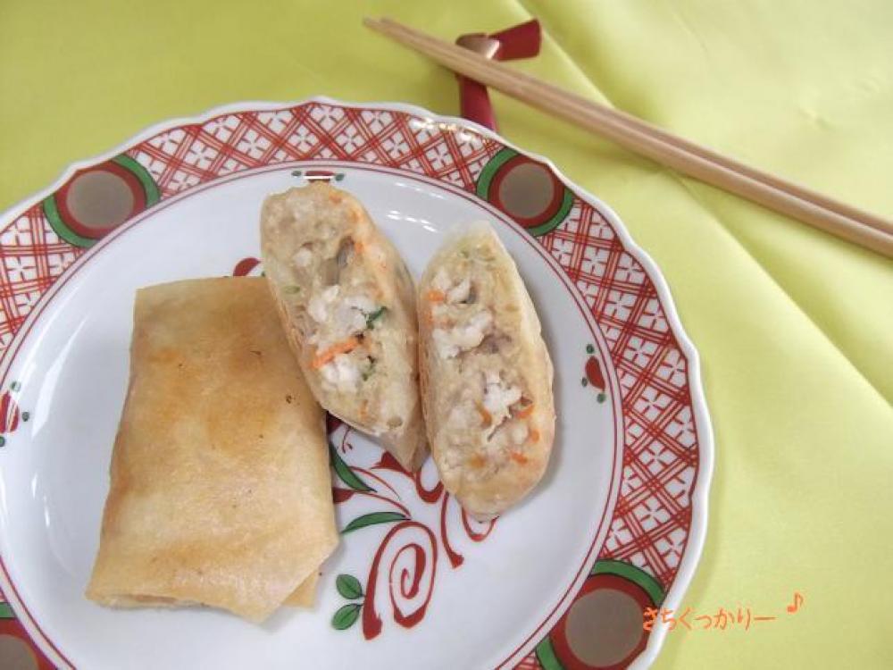 豆腐&挽肉&Bをよく混ぜてから、Aも入れてサックリ混ぜ、春巻きの皮で包んで、水溶き小麦粉で止めます。