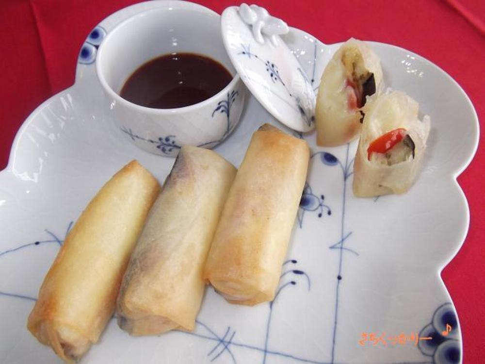 春巻きの皮に茄子→トマト→チーズとのせて包みAで止めます。