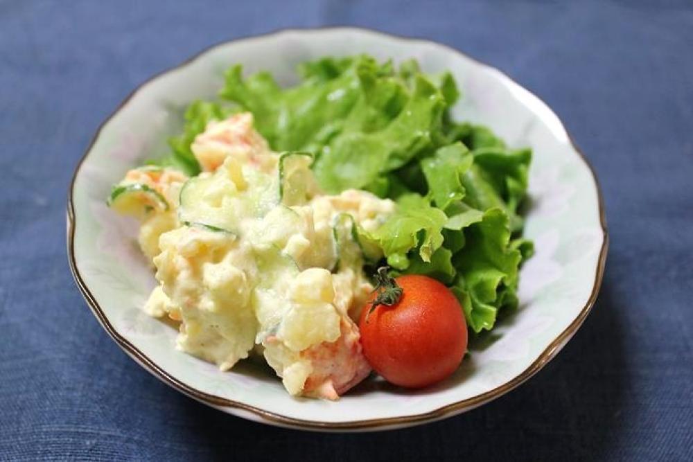 小口切りにしたきゅうりを塩でもみ、絞ってすり潰したじゃがいもとにんじんに混ぜます。
