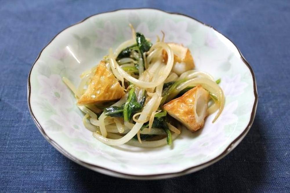 油を熱したフライパンでほうれん草・もやし・ちくわを炒めます。