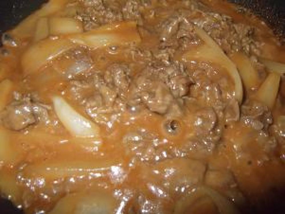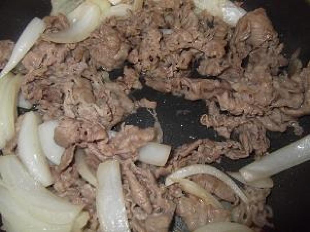 ![]() フライパンにバターを入れ弱火で玉ねぎを炒め透き通り始めたら、牛肉も入れて炒めます。
