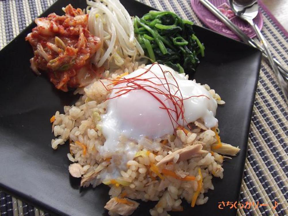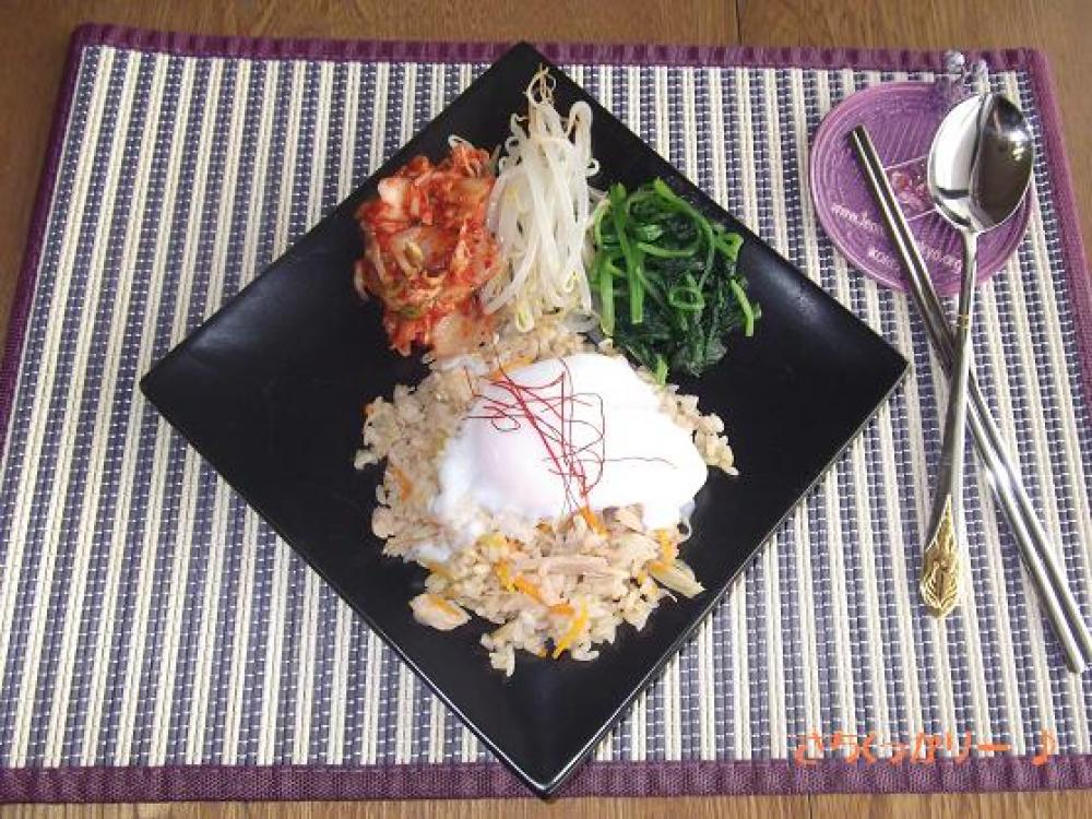 ![]() ご飯が炊けたら器に盛り、ナムル・キムチ・温泉卵を添え、お好みで糸唐辛子をのせたら出来上がり。