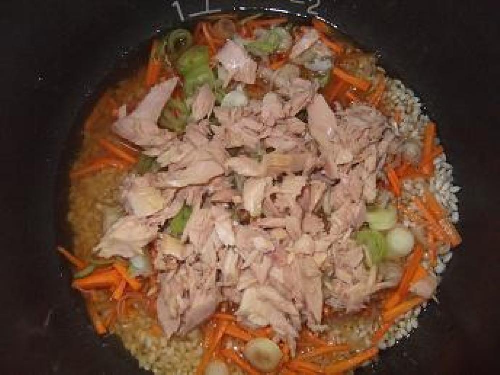 1にBを入れてサックリ混ぜ、ツナ・長ネギ・生姜・人参をのせて炊きます。