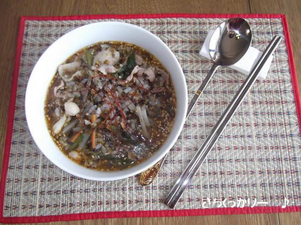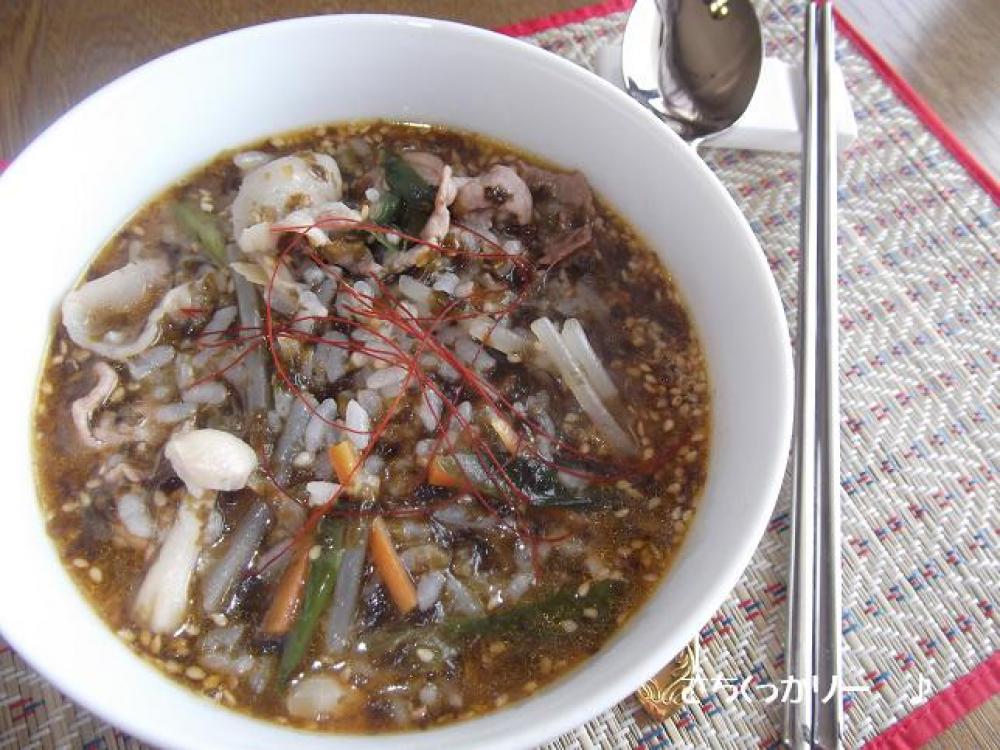 ご飯を洗ってぬめりを取り、5に入れて沸騰したら火を止め、白ゴマを振り器に盛ります。